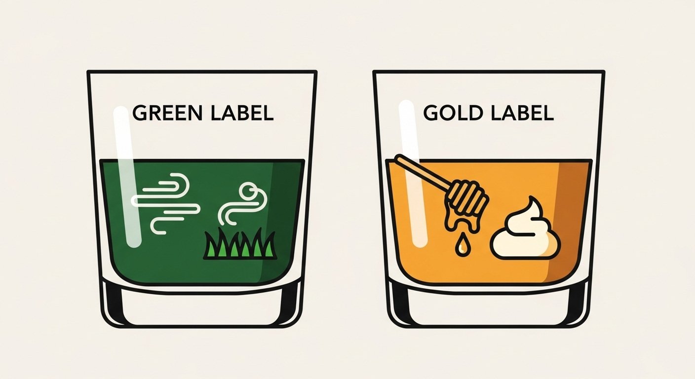 O Green Label é mais intenso em sabor e geralmente tem 43% de álcool, contra 40% do Gold.