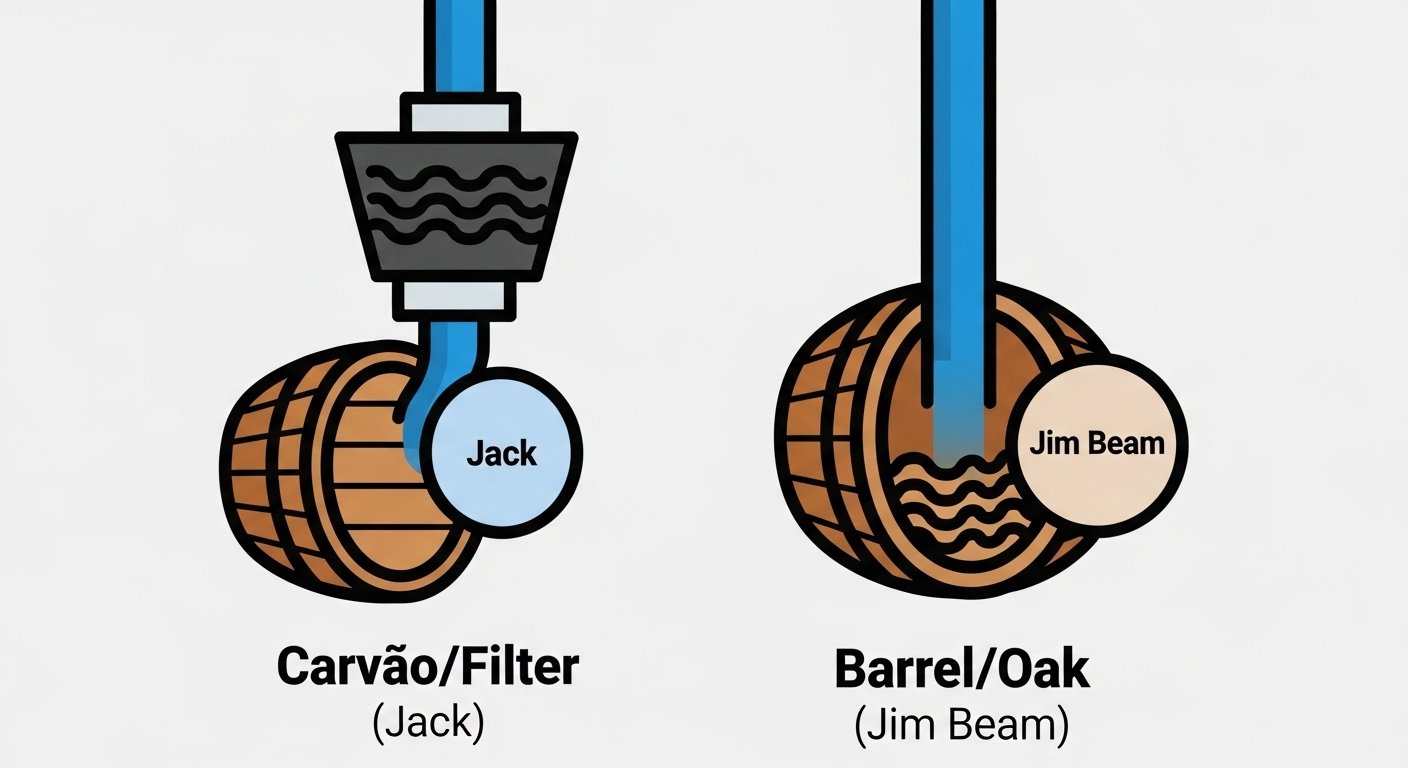 | Processo Chave | Filtragem em Carvão (Mellowing) | Envelhecimento Direto (Sem filtro) |