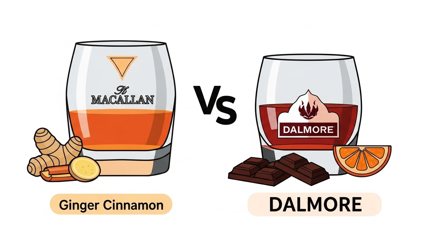 O Dalmore tende a ser percebido como mais suave e doce (“arredondado”) devido às notas de chocolate e laranja.