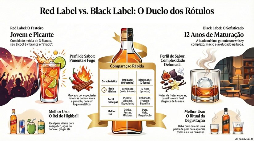 Muitos iniciantes cometem o erro de comprar o Red Label esperando uma experiência suave de degustação e se decepcionam. Outros compram o Black Label para misturar com energético e jogam dinheiro fora. Neste artigo, vou te ensinar a respeitar cada um pelo que ele é.
