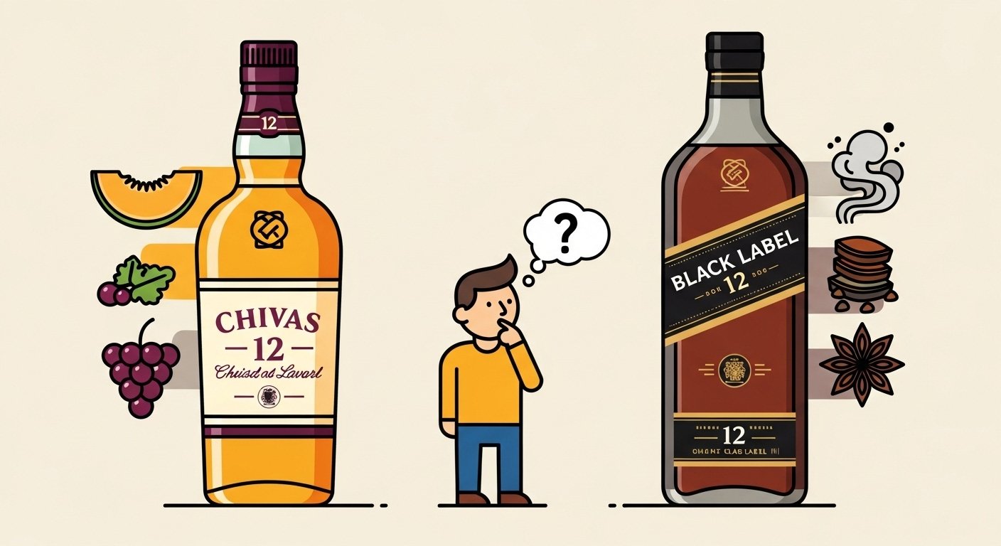 Duas garrafas (Chivas 12 vs. Black Label 12) em comparação, com um consumidor indeciso no meio, representando a dúvida clássica de compra.