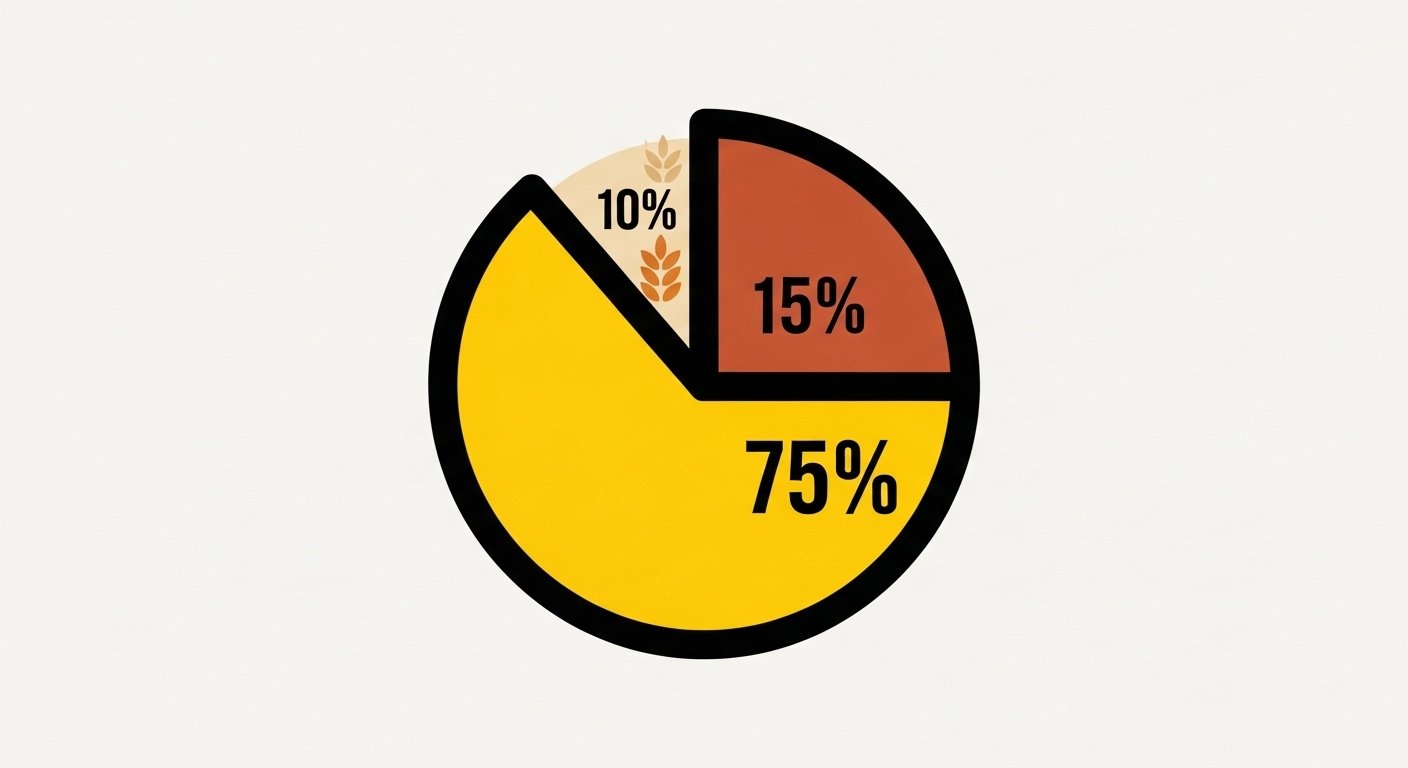 Gráfico de pizza estilizado do Mash Bill mostrando 75% de milho e o restante de centeio/cevada, representando a fórmula do Bourbon.